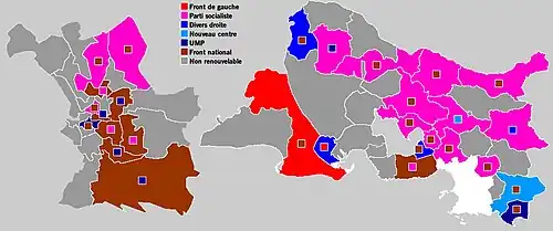 PCF : 6 sièges PS : 30 sièges DVG : 1 siège DVD : 3 siège NC : 2 sièges UMP : 15 sièges