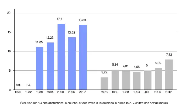 Évolution de l'abstention par rapport au nombre d'inscrits sur la liste électorale et du vote blanc par rapport au nombre de bulletins déposés aux élections communales depuis 1976.