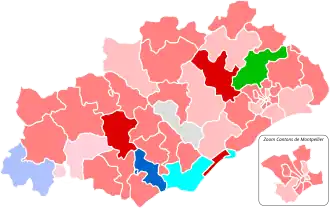 Liste des cantons 1 - Agde , 2 - Béziers-1 , 3 - Béziers-2 , 4 - Béziers-3 , 5 - Cazouls-lès-Béziers , 6 - Clermont-l'Hérault , 7 - Le Crès , 8 - Frontignan , 9 - Gignac , 10 - Lattes , 11 - Lodève , 12 - Lunel , 13 - Mauguio , 14 - Mèze , 15 - Montpellier-1 , 16 - Montpellier-2 , 17 - Montpellier-3 , 18 - Montpellier-4 , 19 - Montpellier-5 , 20 - Montpellier - Castelnau-le-Lez , 21 - Pézenas , 22 - Pignan , 23 - Saint-Gély-du-Fesc , 24 - Saint-Pons-de-Thomières , 25 - Sète