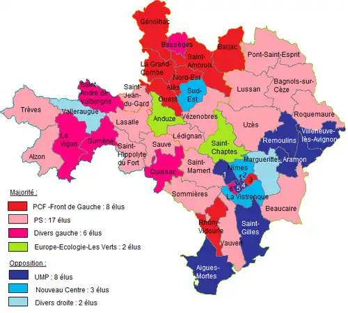 Liste des cantons 1 - Aigues-Mortes , 2 - Alès-1 , 3 - Alès-2 , 4 - Alès-3 , 5 - Bagnols-sur-Cèze , 6 - Beaucaire , 7 - Calvisson , 8 - La Grand-Combe , 9 - Marguerittes , 10 - Nîmes-1 , 11 - Nîmes-2 , 12 - Nîmes-3 , 13 - Nîmes-4 , 14 - Pont-Saint-Esprit , 15 - Quissac , 16 - Redessan , 17 - Roquemaure , 18 - Rousson , 19 - Saint-Gilles , 20 - Uzès , 21 - Vauvert , 22 - Le Vigan , 23 - Villeneuve-lès-Avignon