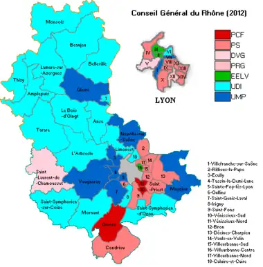 - 1 2 3 « Départementales 2015 : l’UMP s’offre le Rhône pour la première fois de son histoire », sur lyonmag.com, (consulté le ).