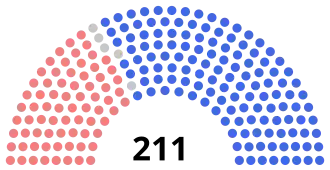 | Total sièges | 6 | 5 | 92 | 65 | 16 | 21 | 6 | 211 | ||