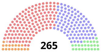 | Total sièges : | 22 | 17 | 17 | 14 | 85 | 75 | 10 | 12 | 4 | 7 | 1 | 1 | 265 | ||