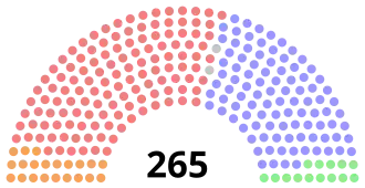 | Total sièges : | 22 | 17 | 17 | 14 | 85 | 75 | 10 | 12 | 4 | 7 | 1 | 1 | 265 | ||