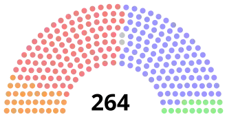 | Total sièges : | 23 | 19 | 13 | 13 | 88 | 74 | 10 | 11 | 4 | 7 | 1 | 1 | 264 | ||