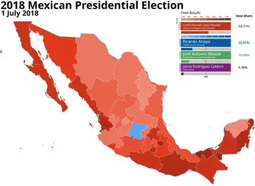Les élections au niveau fédéral mènent à une alternance. Andrés Manuel López Obrador (Mouvement de régénération nationale : gauche) est élu président avec 53,2 % des voix, face à quatre autres candidats dont notamment Ricardo Anaya (Parti action nationale : droite ; 22,3 %) et José Antonio Meade (PRI ; 16,4 %). C'est la première fois depuis 1928 que la présidence n'est pas exercée par le PRI ou le PAN. La coalition ayant porté Obrador à la présidence remporte également la majorité des sièges dans les deux chambres.