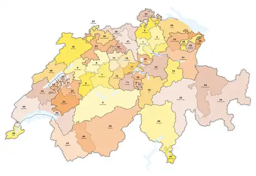 Le taux de participation le plus élevé est dans le Canton de Schaffhouse où le vote obligatoire fait déplacer 95,2 % du corps électoral (+0,1 %). À l'inverse, dans le Canton de Schwytz seulement 28,3 % du corps électoral prend part au vote.