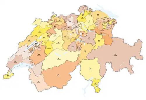 - +1 pour chaque canton de Bâle-Campagne, Bâle-Ville, Fribourg, Genève, des Grisons, Lucerne, Neuchâtel, Soleure, Tessin et Thurgovie.