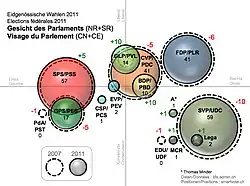 - ↑ Données : Office fédéral de la statistique : Élection au Conseil national et Élection au Conseil des États ; Positions : Cartographie Smartvote Sites consultés le 6 décembre 2011