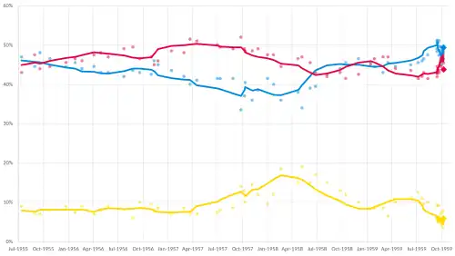 Pour la première fois depuis les élections générales de 1929, le Parti libéral parvient à gagner des voix, même s'il ne concrétise pas ses résultats en sièges[3]. Pour cela, le parti avait présenté plus du double de candidats par rapport aux élections précédentes[4]. Cela s'explique en grande partie par le fait que le scrutin uninominal majoritaire à un tour défavorise les petits partis[5]. Quant au Parti travailliste, il perd des sièges pour la quatrième fois de suite depuis les élections générales de 1950[6]. Le Parti travailliste a notamment été desservi par ses divisions internes mais aussi par son programme où les nombreuses nationalisations prévues ont pu avoir un effet repoussoir pour l'électorat, de l'aveu même de Hugh Gaitskell lors du congrès annuel du parti à Blackpool en novembre 1959[7].