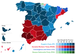Le Parti populaire s'impose dans 34 circonscriptions sur 52 et dans 13 communautés autonomes sur 17. La déroute attendue du Parti socialiste est déjouée par la mobilisation de son électorat en Andalousie, en Catalogne et en Estrémadure, tandis qu'il l'emporte dans 15 circonscriptions électorales. Les trois restantes reviennent aux partis nationalistes catalan et basque. Au Sénat, le Parti populaire s'adjuge la majorité absolue des sièges à pourvoir[24].