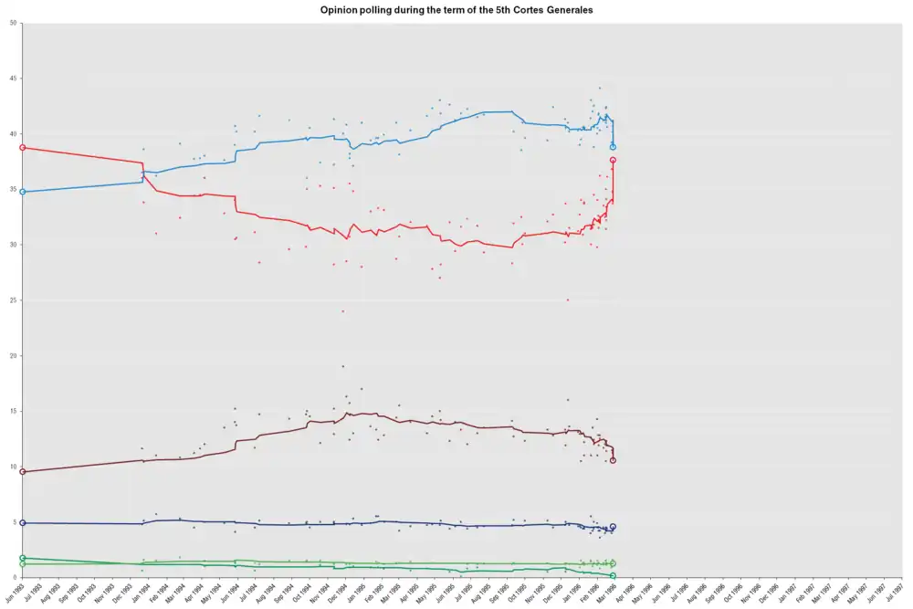 Après 14 ans au pouvoir, le président du gouvernement socialiste Felipe González est contraint de convoquer les élections avec un an et demi d'avance, ayant perdu l'appui extérieur des nationalistes catalans de Jordi Pujol, qui a fait voter à l'automne le rejet du projet de loi de finances. Depuis sa victoire à la majorité relative de 1993, la stabilité de son gouvernement était en effet tributaire du soutien sans participation des partis nationalistes périphériques basque et catalan.