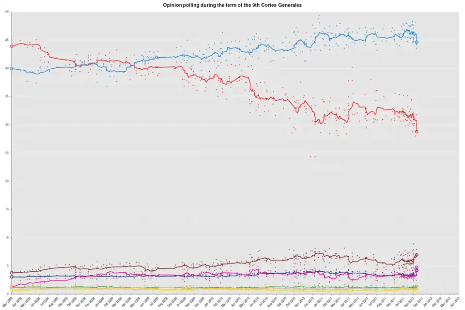 En 2011, Zapatero fait savoir qu'il ne sera pas candidat à sa succession aux prochaines élections générales[9], ce qui n'empêche pas le PP de remporter largement les élections régionales et locales du 22 mai avec plus de dix points d'avance au niveau national, les socialistes perdant leurs fiefs des Asturies, de Castille-La Manche et d'Estrémadure[10]. Deux mois plus tard, il annonce la tenue de législatives anticipées, convoquées avec quatre mois d'avance sur le calendrier prévu.
