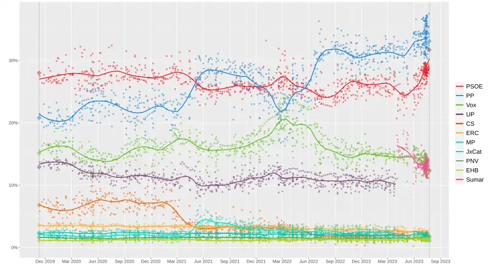 Le graphique ci-dessous est une synthèse des résultats des sondages réalisés depuis les élections du 10 novembre 2019. La largeur du graphique correspond à la durée théorique du mandat de quatre ans de la législature issue de ces élections. La publication de sondages électoraux est interdite en Espagne quelques jours avant le scrutin.