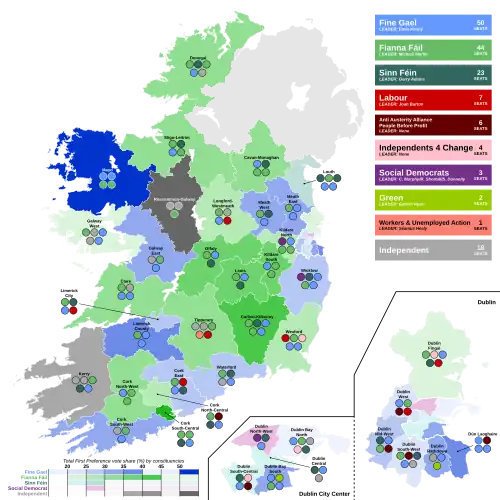 La coalition au pouvoir perd 23,4 points de suffrages, passant de 55,5 % à 32,1 %, et perd ainsi la majorité absolue. C'est une sanction pour les deux partis la composant : le Fine Gael perd 10,6 points (de 36,1 % à 25,5 %) et le Parti travailliste qui perd 12,8 points (de 19,4 % à 6,6 %). Pour Romaric Gaudin de La Tribune, la construction d'une majorité stable va être très difficile et une « grande coalition » entre le Fine Gael et le Fianna Fáil semble probable[64].