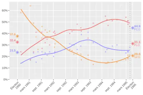 Initialement très populaire, le NPD chute drastiquement dans les sondages du printemps 1991 au printemps 1994, le parti obtenant à ce moment-là seulement 15 % d'appui dans les intentions de votes. Le Parti libéral et le Parti progressiste-conservateur profitent de l'effondrement des appuis au NPD, même si les libéraux maintiennent une avance d'environ 10 points sur les progressistes-conservateurs jusqu'à la mi-1993.