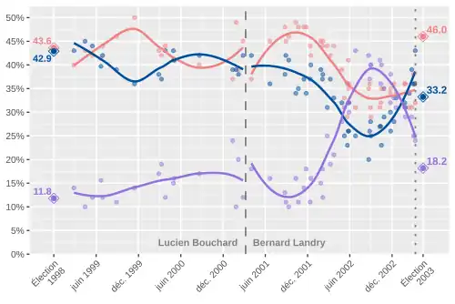 Bernard Landry, premier ministre et chef du PQ, entreprend la revitalisation du parti et de son image. À mesure que la nature conservatrice de la plate-forme adéquiste devenait plus apparente, la popularité de ce parti commence à baisser. Des mesures social-démocrates adoptées par le gouvernement péquiste, telles l'adoption de la Loi contre la pauvreté, aident à améliorer les résultats du parti dans les sondages. Jean Charest, chef du Parti libéral, continue d'être impopulaire auprès des électeurs. Ces facteurs aident le PQ à regagner l'appui de plusieurs voteurs au début 2003 pour reprendre la première place dans les sondages.