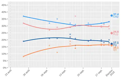 Le premier ministre Philippe Couillard a déclenché le 23 août 2018 les élections générales au moyen d'un décret signé par le lieutenant-gouverneur du Québec[3]. Il avait annoncé cette date le 11 août précédent, durant un discours devant le congrès des jeunes libéraux. La campagne électorale durera 39 jours.