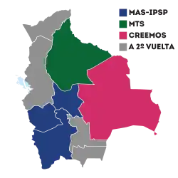Cependant, la plupart des assemblées législatives départementales demeurent contrôlées par le MAS. Même dans Santa Cruz où la coalition Creemos remporte facilement dès le premier tour, le nombre de membres d'assemblée provenant du MAS égale le nombre de membres de Creemos. Pour constituer le groupe majoritaire de cette assemblée, le MAS conclut un pacte avec les membres des peuples indigènes[65].