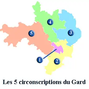 1re circonscription cantons de : Nîmes-1 - Nîmes-3 - Nîmes-4 - Nîmes-5 - Nîmes-6 - La Vistrenque.