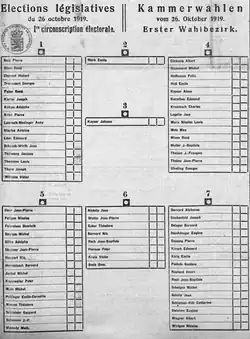 - ↑ (de) « Résultats officiels des élections législatives de 1919 et rectificatifs dans les circonscriptions Sud, Est et Nord », Luxemburger Wort, (lire en ligne, consulté le ).