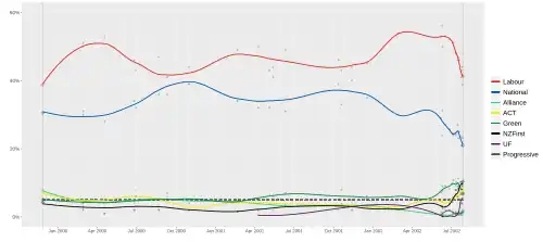 Le Parti travailliste de la Première ministre sortant Helen Clark arrive en tête des élections avec 41 % des suffrages. De son côté, le Parti national réalise le pire score de son histoire en rassemblant moins de 21 % des voix. Cette débâcle des conservateurs profite à Nouvelle-Zélande d'abord ainsi qu'à United Future, porté par la performance de son chef Peter Dunne (en) lors du débat télévisé[1].