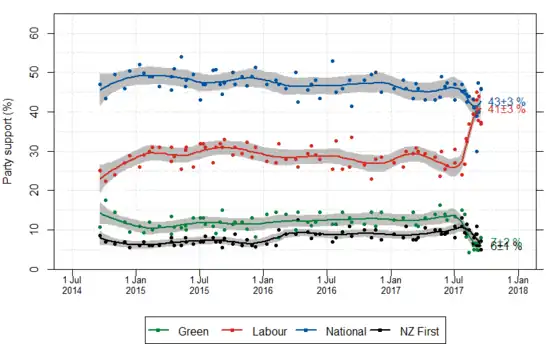 Le , un sondage indique 43 % d'intentions de vote pour les travaillistes, leur meilleur score depuis dix ans, les positionnant devant le Parti national (41 %). Le parti Nouvelle-Zélande d'abord serait à 8 %, et les Verts à 5 %[14],[15]. Un sondage le donne le Parti national à 43,3 % d'intentions de vote, le Parti travailliste à 39,4 %, Nouvelle-Zélande d'abord à 6,6 %, et les Verts à 6,1 %[16]. Le , l'estimation de Radio New Zealand, croisant différents sondages, donne 41,3 % des intentions de vote et 51 sièges au Parti national, 40,5 % et 50 sièges au Parti travailliste, 7,5 % et neuf sièges à Nouvelle-Zélande d'abord, 5,5 % et sept sièges aux Verts, 1,4 % et deux sièges au Parti maori, et 0,9 % et un siège au parti ACT[17].