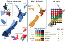Le pays est divisé en soixante-cinq circonscriptions uninominales dites « circonscriptions générales » (general electorates), auxquelles sont superposées sept circonscriptions uninominales dites « circonscriptions maoris » (Maori electorates), pour un total de soixante-douze[11],[12]. Les sièges maoris existent depuis 1867, afin de garantir que les Maoris soient représentés au Parlement. Les citoyens maoris peuvent néanmoins choisir de s'inscrire sur les listes générales[13].