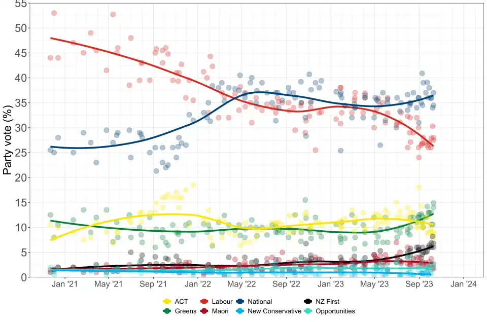 Le gouvernement mené par le Parti travailliste du Premier ministre Chris Hipkins fait face à une importante baisse de popularité face au Parti national mené par Christopher Luxon, sans qu'aucune des deux formations ne paraisse en mesure de former seule le prochain gouvernement.