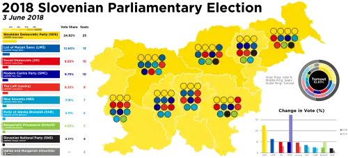 Dans l'opposition depuis cinq ans, le Parti démocratique slovène (SDS) de Janez Janša l'emporte après une campagne axée sur la question migratoire. Parmi les nombreux partis du centre et du centre gauche, la Liste de Marjan Šarec (LMŠ) tire son épingle du jeu alors que le Parti du centre moderne (SMC) de Miro Cerar perd les deux tiers de ses voix.