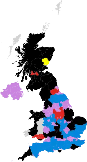| 35 conseils en Angleterre, 32 en Écosse, 22 au pays de Galles et 8 maires | ||||||||||||||
