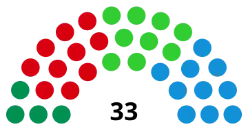| 33 conseillers municipaux (majorité absolue : 17 conseillers municipaux) | ||||||||||||||