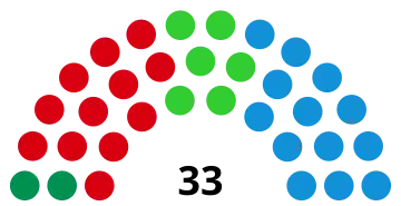 | 33 conseillers municipaux (majorité absolue : 17 conseillers municipaux) | ||||||||||||||