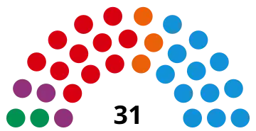 | 31 conseillers municipaux (majorité absolue : 16 conseillers municipaux) | ||||||||||||||