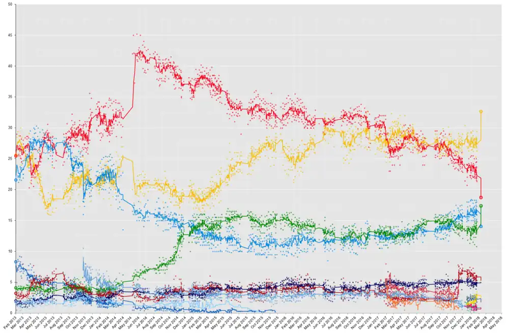 Le , constatant l'échec des négociations et le maintien par l'ensemble des partis de leurs points de blocages respectifs, Mattarella annonce son intention de nommer un nouveau gouvernement neutre et apolitique, qui serait chargé des affaires courantes en attendant l'organisation d'élections anticipées, possiblement en juillet. Les sondages prévoient alors un maintien de la situation de blocage à défaut d'un changement de loi électorale, le M5S, et les coalition de centre gauche et de centre droit conservant leurs intentions de vote respectives. Au sein de cette dernière, cependant, une tendance vers un important report des voix de Forza Italia vers la Ligue est souligné.