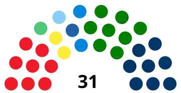 La liste du président élu peut recevoir d'emblée une prime majoritaire portant sa part des sièges au-dessus de la majorité absolue. La liste reçoit ainsi 16 sièges si elle a obtenu entre 34 et 37 % des suffrages, 17 sièges si elle a obtenu entre 37 et 40 %, et 18 sièges au-delà. Les sièges restants sont ensuite repartis à la proportionnelle aux différentes listes ayant franchi le seuil électoral, et à leurs candidats en fonction des votes préférentiels qu'ils ont recueillis. Le seuil de 5 % est abaissé à 3 % pour les listes se présentant au sein d'une coalition. Par ailleurs, le président élu devient de droit membre du conseil, ce qui porte le total de conseillers à 31[5].