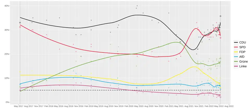 | Forsa | 04/05/2022 | 32 % | 28 % | 17 % | 7 % | 3 % | 6 % |