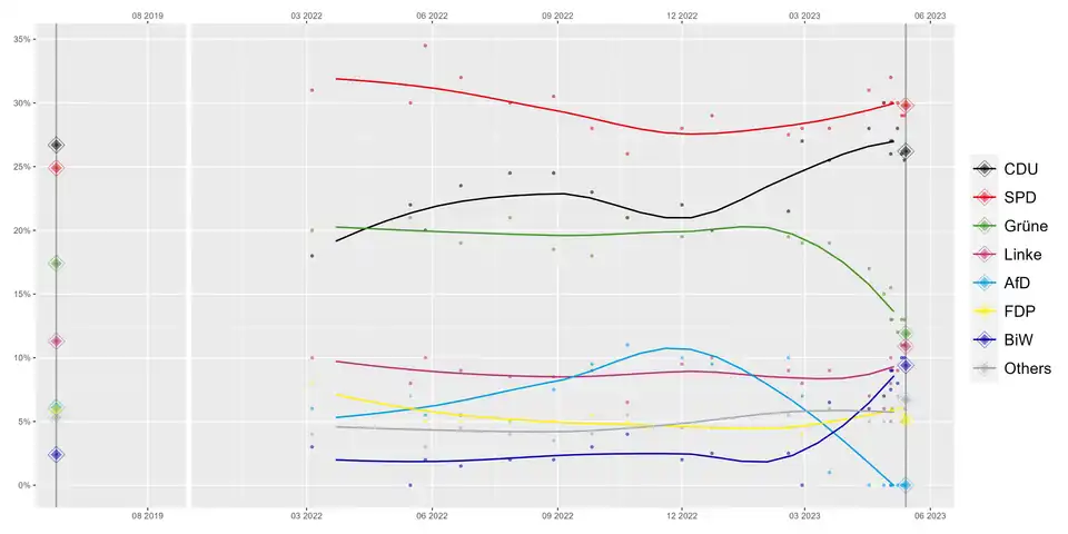 | Institut | Date | CDU | SPD | Grünen | FDP | Linke | AfD | BiW |