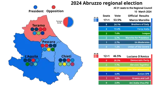 | Partis | L'Aquila | Chieti | Pescara | Teramo | Total | |||||||||