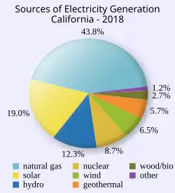 En 2017, la Californie se classait au 2e rang parmi les États des États-Unis pour la production hydroélectrique conventionnelle, au 1er rang pour la production d'électricité à partir de biomasse, de géothermie et d'énergie solaire et au 5e rang pour la production totale d'électricité[7]. Elle se classait au 15e rang pour la production nette d'électricité nucléaire après la fermeture définitive de l'une de ses deux centrales nucléaires, celle de San Onofre en .