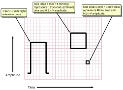 - un calibrage correct : étalonnage de la vitesse de déroulement du papier de 25 mm/s et étalonnage en amplitude de 1 cm/mV. Ces deux informations sont systématiquement reportés sur le tracé, et l'étalonnage en amplitude est prouvé par un signal de calibration visible sur le tracé. Un bon étalonnage est indispensable à l'analyse du tracé. L'unité Ashmann est définie par 0,1 mV égale 0,04 s, qui correspond à un carré de 1 mm de côté. Toute modification d'étalonnage modifie l'amplitude des déflexions et rend l'ECG ininterprétable au regard des références classiquement utilisées.