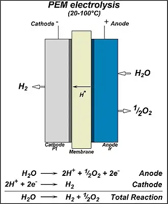 L'électrolyse à membrane électrolytique polymère utilise un électrolyte polymère perméable aux protons de l'anode vers la cathode mais isolant électrique entre les électrodes afin de bloquer le retour des électrons de l'anode vers la cathode. Dans les conditions normales de température et de pression, l'enthalpie de décomposition de l'eau vaut ΔH = 285,9 kJ/mol, fournie en partie sous forme d'énergie thermique, le reste étant fourni sous forme d'énergie électrique[8].