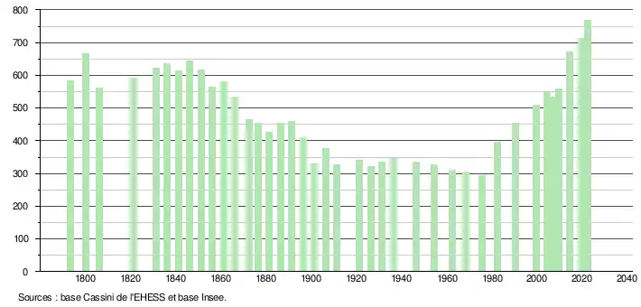 L'évolution du nombre d'habitants est connue à travers les recensements de la population effectués dans la commune depuis 1793. Pour les communes de moins de 10 000 habitants, une enquête de recensement portant sur toute la population est réalisée tous les cinq ans, les populations de référence des années intermédiaires étant quant à elles estimées par interpolation ou extrapolation[19]. Pour la commune, le premier recensement exhaustif entrant dans le cadre du nouveau dispositif a été réalisé en 2004[20].