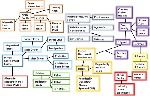 - Polywell : Ce dispositif tente de combiner le confinement magnétique avec des champs électrostatiques, pour éviter les pertes par conduction générées par la cage[42].