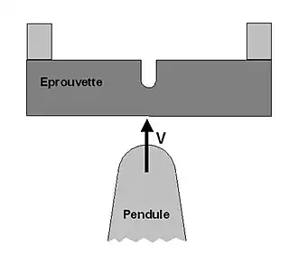 Une éprouvette entaillée est placée sur deux appuis. Le pendule est lâché d’une hauteur déterminée de façon à frapper l’éprouvette avec une vitesse entre 1 et 4 m/s. La hauteur de remontée du pendule après le choc permet de déterminer l’énergie nécessaire pour rompre l’éprouvette.