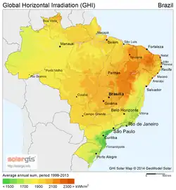 Selon le Solar and Wind Energy Resource Assessment (SWERA) financé par les Nations unies, le potentiel solaire brésilien (1500-2 500 kWh/m2) est supérieur à celui des pays européens : Allemagne (900-1 250 kWh/m2), France (900-1 650 kWh/m2) et Espagne (1200-1 850 kWh/m2) ; le meilleur potentiel réside dans les régions semi-arides du nord-est[2].