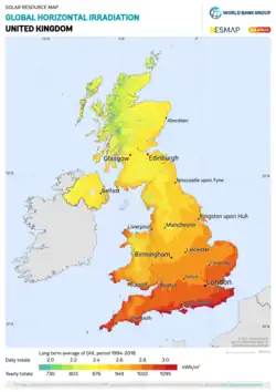 La puissance brute moyenne du rayonnement solaire par mètre carré d'un toit orienté vers le sud en Grande-Bretagne est d'environ 110 W/m2, et la moyenne sur un terrain plat est d'environ 100 W/m2[1]. La production annuelle est donc au maximum de 964 kWh/m2.