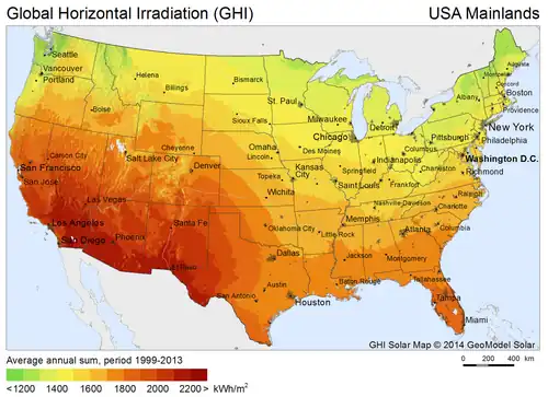 Les régions situées au Sud-Ouest des États-Unis bénéficient d'un excellent potentiel solaire : des zones étendues dépassent 7 kWh/m2/jour (comparaison : 4,5 kWh/m2/j en Provence-Alpes-Côte d'Azur). C'est bien évidemment dans ces régions (sud de la Californie, Colorado, Arizona, Nevada, Nouveau-Mexique) que les centrales solaires se sont le plus développées. Un rapport publié en 2012 par le National Renewable Energy Laboratory (NREL), principal laboratoire national du Département de l'Énergie des États-Unis, consacré à la recherche sur les énergies renouvelables et l'efficacité énergétique, évalue le potentiel technique des énergies renouvelables[1] ; comme il ne prend en compte ni les contraintes économiques ni celles de marché, l'exercice reste purement théorique, mais il permet d'identifier les régions les plus favorables :