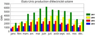 L'énergie solaire aux États-Unis, longtemps limitée à la Californie, connait une croissance très rapide dans la plupart des États depuis la mise en place de politiques de soutien à partir de 2008-2009.
