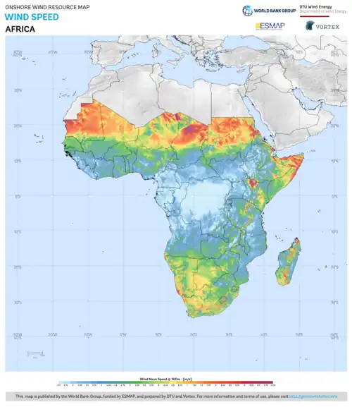 Le vent est beaucoup moins bien distribué que les ressources solaires, avec des emplacements optimaux positionnés à proximité d'emplacements côtiers, de chaînes de montagnes et d'autres sites naturels dans le nord et le sud. La disponibilité du vent sur la côte ouest de l'Afrique dépasse 3 750 kW/h et peut s'adapter aux perspectives futures de la demande d'énergie[11],[12]. L'Afrique centrale dispose de ressources éoliennes inférieures à la moyenne du continent[13].